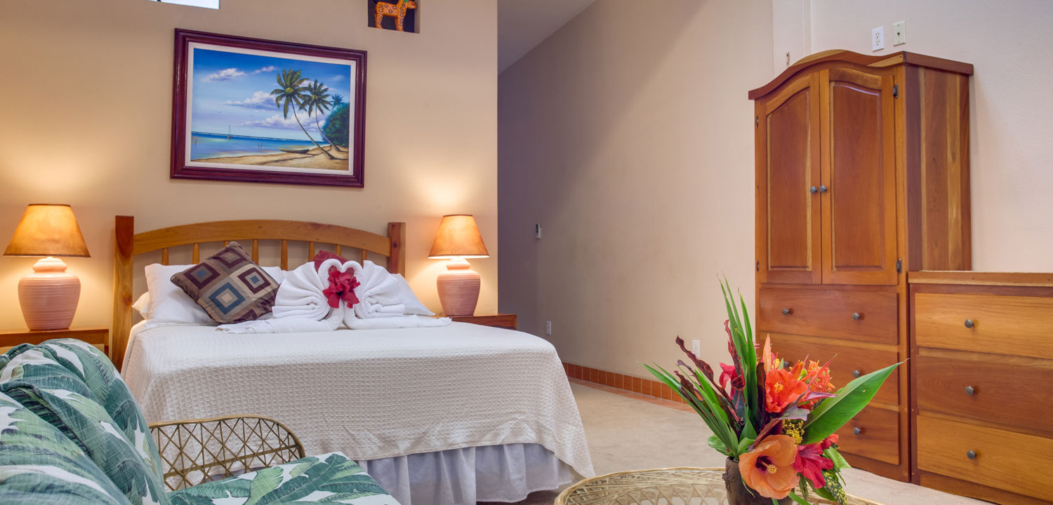 This room is spacious yet cozy and has one or two queen beds. It has a shared veranda both in the back and in front of the room. It has no direct views of the sea but the beach is just a few yards away.